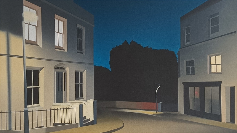 Ian Paterson, also Brighton-based is a painter with a highly perfected airbrush quality, creating a sense of calm and space, focusing on beautiful birds, still life and highly evocative interpretations of street corners in Brighton by lamplight.